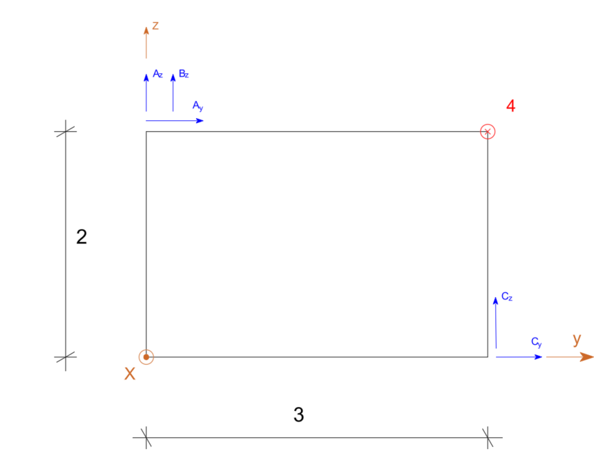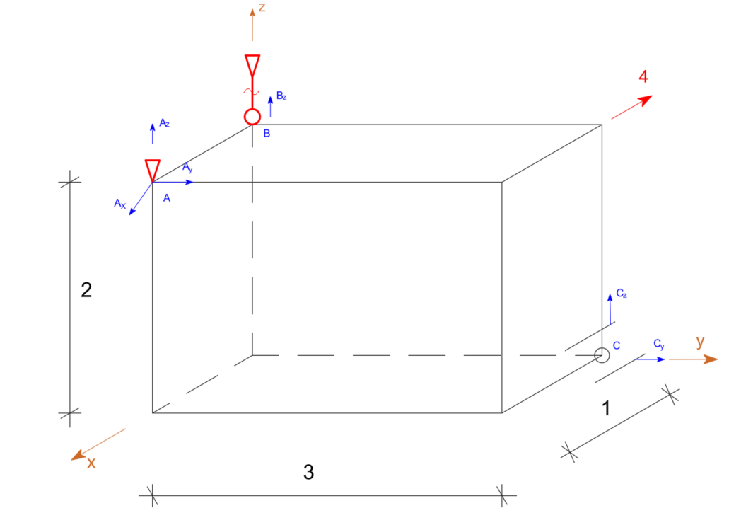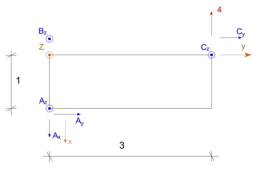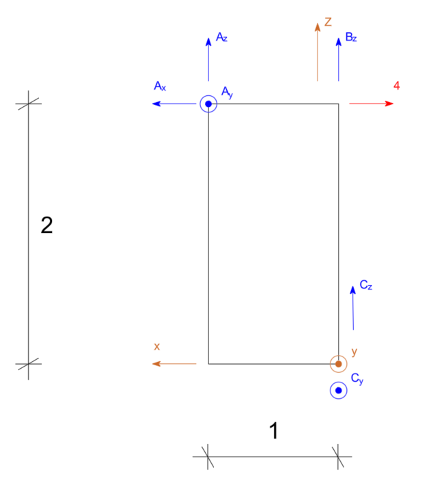 \begin{aligned} & \Sigma F_x=0 \quad A_x-4=0 \quad A_x=4 \\ & \Sigma F_y=0 \quad A_y+C_y=0 \\ & \Sigma F_z=0 \quad A_z+B_z+C_z=0 \\ & \end{aligned}Suma momentów względem osi X
