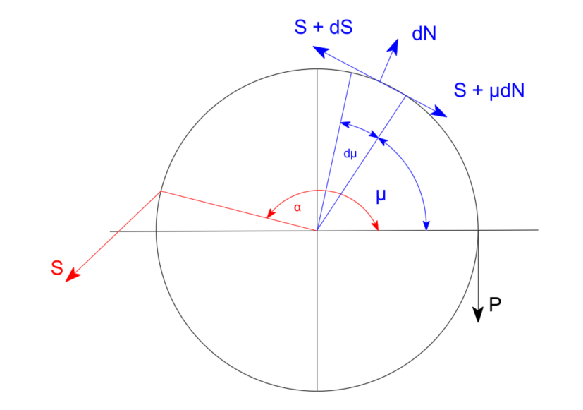 \begin{aligned} &\varphi=0, S=P\\ &P=e^C e^{0}=e^C\\ &S=Pe^{\mu \varphi}\\ \end{aligned}Podstawiając za \(\varphi\) kąt opasania \(\alpha\)