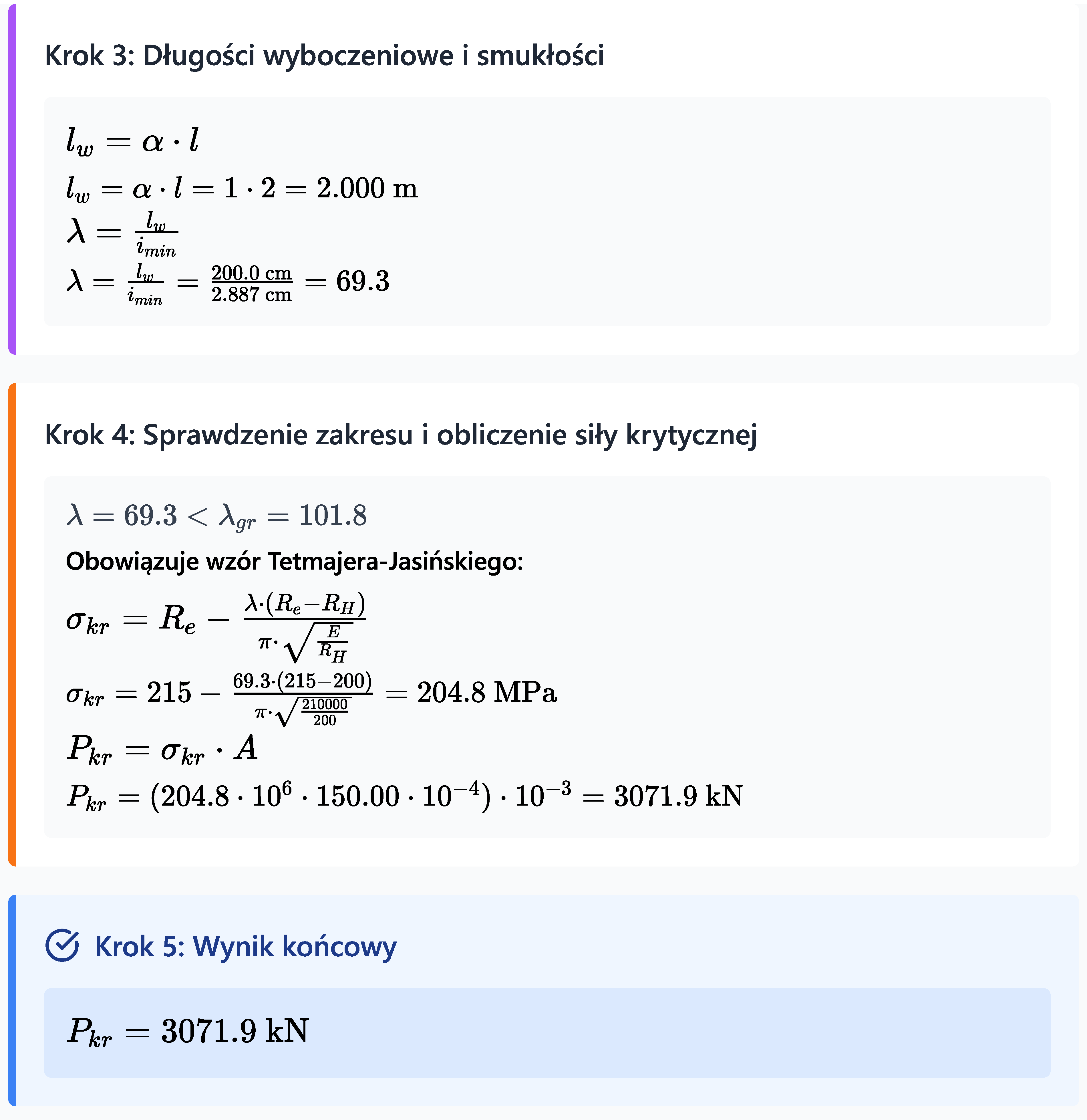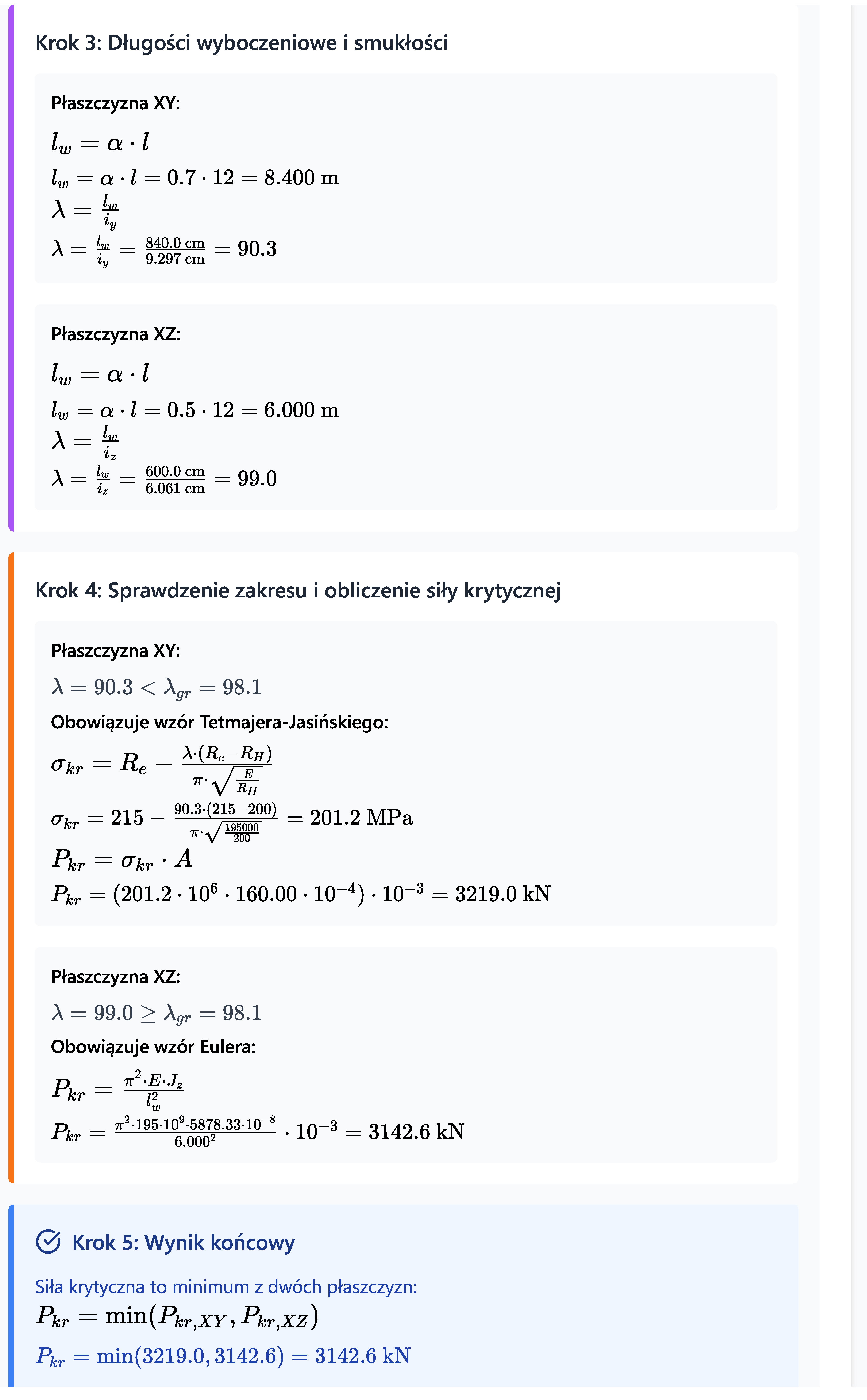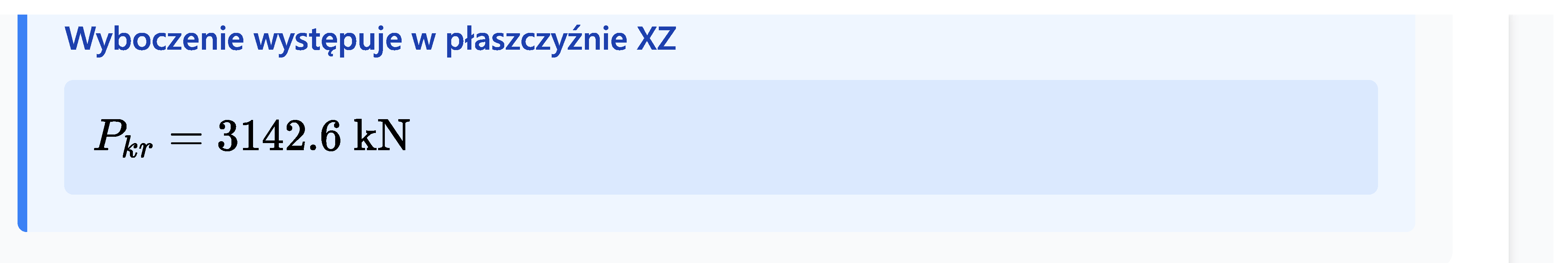 - Oblicz siłę krytyczną dla tej płaszczyzny: \(P_{kr,XZ} = \sigma_{kr,XZ} \cdot A\).