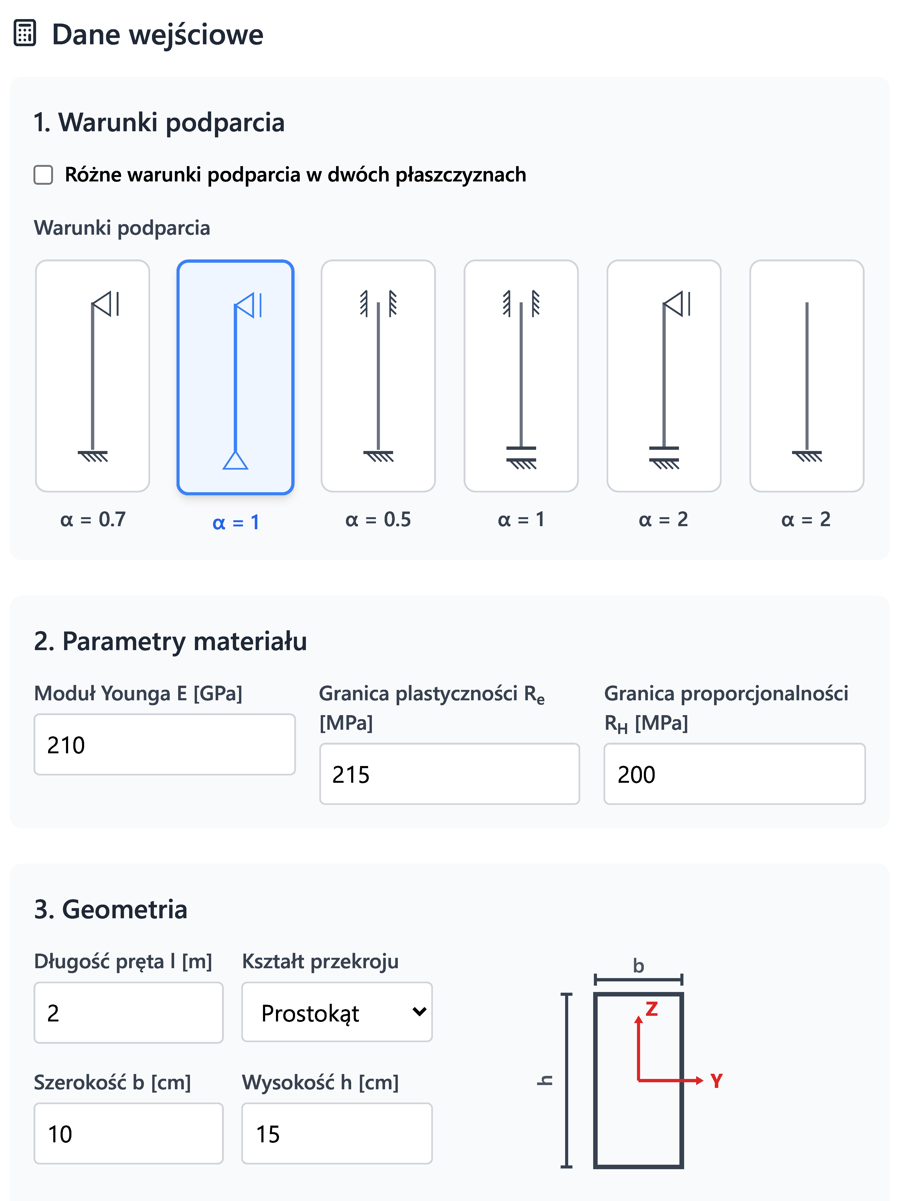 - Oblicz długość wyboczeniową: \(L_{w,XZ} = \alpha{XZ} \cdot L\).