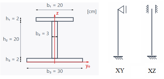 \begin{aligned} & P_{k r}=\frac{\pi^2 \cdot E \cdot J_{\min }}{l_w^2} \\ & P_{k r}=\frac{\pi^2 \cdot 210 \cdot 10^9 \cdot 1250.00 \cdot 10^{-8}}{4.000^2} \cdot 10^{-3}=1619.2 \mathrm{kN} \end{aligned}Przykład obliczeniowy - różne warunki podparcia w dwóch płaszczyznach